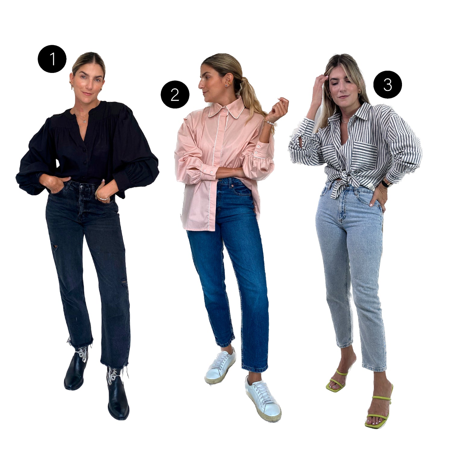 3. CAMISA DE RAYAS AMARRADA + JEANS BÁSICOS + SANDALIAS ALTAS